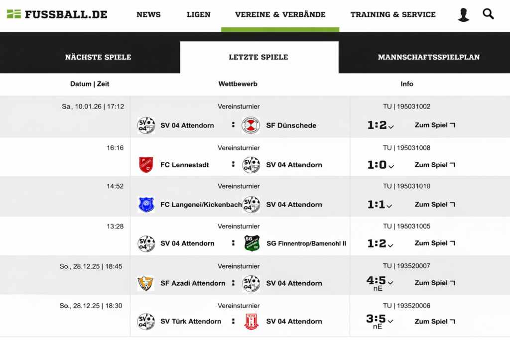Hier findet ihr alle aktuellen News rund um den SV 04 Attendorn.Von Spielberichten über Trainingsupdates bis zu Vereinsmeldungen –wir halten euch stets auf dem Laufenden, was auf und neben dem Platz passiert.